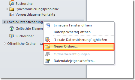 Dazu mit der rechten Maustaste im linken Strukturbaum von Outlook auf den Namen der Datendatei klicken und Neuer Ordner… wählen.
