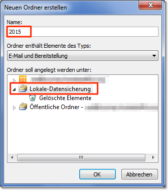 Tragen Sie unter Name, den neuen Ordnername (z.B. 2015) ein. Achten Sie darauf, dass tatsächlich die lokale Datendatei (Lokale-Datensicherung) ausgewählt und somit grau hinterlegt ist. Bestätigen Sie die Eintragung mit OK.